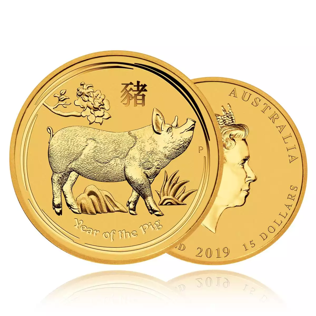 1/10oz gold coin 2019, year of the pig, Perth Mint. Available singularly, in rolls of 20, or boxes of 100 at a varying discount.