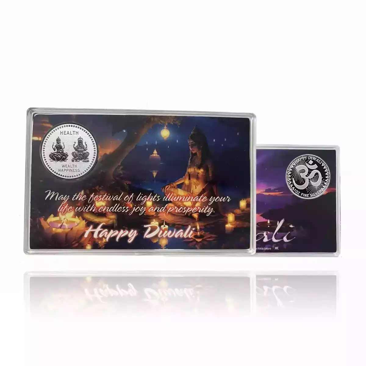 Introducing the exquisite 1oz Silver Diwali Round - astunning celebration of the Festival of Lights! This exquisitely crafted collectible, enclosed in a protective plastic case, captures the essence of Diwali, the most cherished festival in the Hindu calendar. With its rich symbolism and intricate design, this round is a testament to the enduring traditions and cultural heritage of Diwali