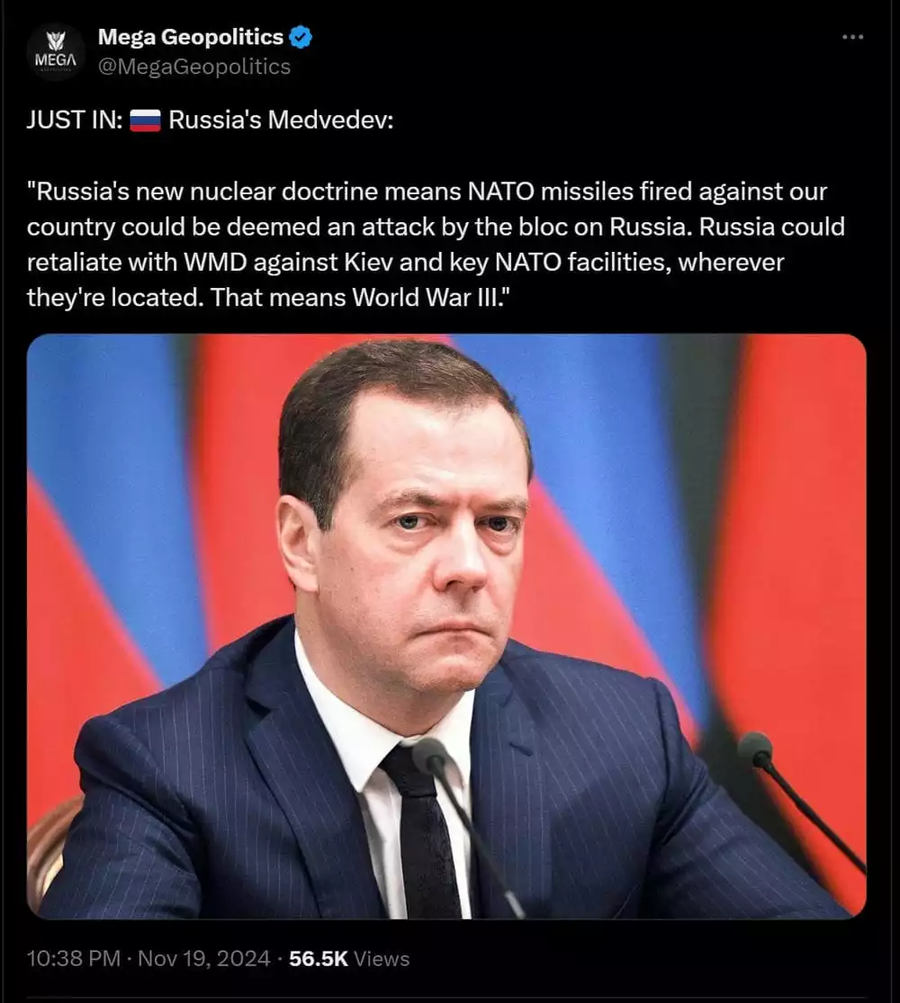 “Russia’s new nuclear doctrine means NATO missiles fired against our country could be deemed an attack by the bloc on Russia. Russia could retaliate with WMDs against Kyiv and key NATO facilities, wherever they’re located. That means World War III.”