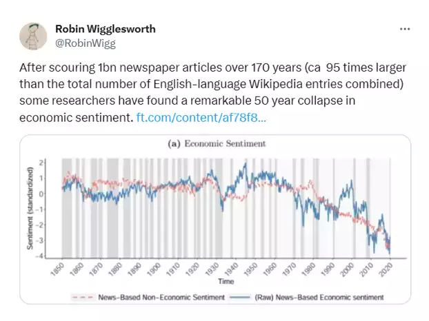 Since the golden age of the post war boom 1945-1970, and since the dissolution of Bretton Woods, economic sentiment has been collapsing with wage share of economic growth also collapsing.