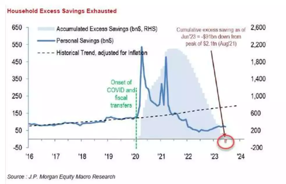 As the warning signs mount of a nasty recession dead ahead, a major revision by JP Morgan reveals all the free money dished out to Americans during COVID is all gone and the sugar hit of ‘Bidenomics’ fiscal stimulus wearing off. And so, we may see yet another catalyst for a recession as the (until now strong) consumer spending support is removed.