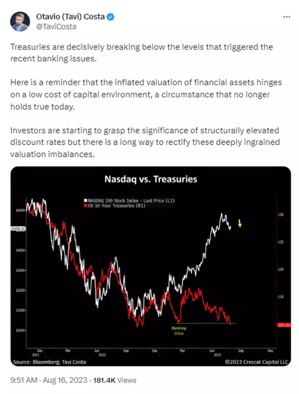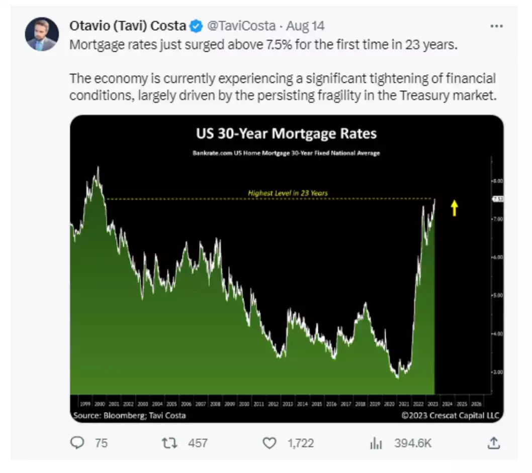 The ‘hope strategy’ of the soft landing for the US looks to be quickly disappearing. The bond market looks incredibly precarious and threatening higher rates for longer despite the falling inflation figures. That means as more and more Americans refinance their loans they are looking at the following reality – a 23 year high interest rate: