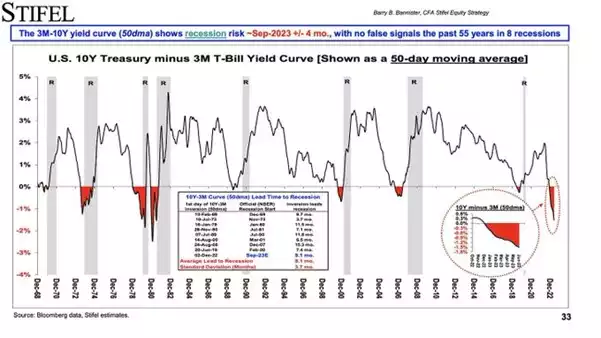 Over the last 55 years, every inversion between the 3-month and 10-year yield curve was followed by a recession. The shortest lag between inversion and the recession was 3 months and the longest lag was 15 months.