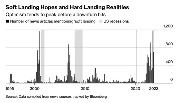 But an economic indicator like yield curve inversion seems to be at odds with the public narrative that a soft landing will be possible, right? Well, Bloomberg recently did a study that showed a rapid increase in articles talking about a soft landing was usually followed by a recession.