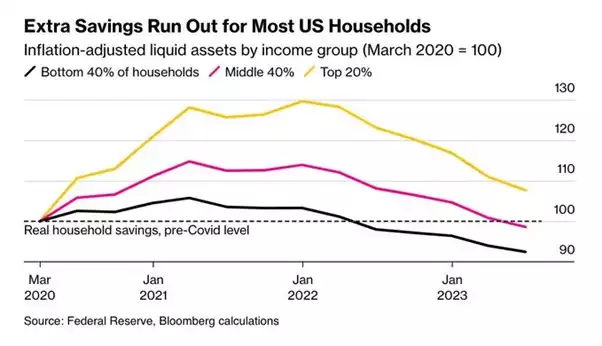 Anna Wong and Tom Orlik have also pointed out that American household’s savings is beginning to run out. This savings had drastically increased during the quantitative easing period related to the pandemic, but households can only hold on for so long before the money starts to run dry. [We wrote to this in more detail here].