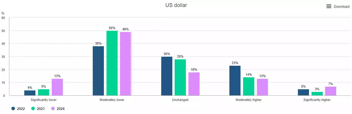 When asked what the most important topics are that determine reserve management decisions, 94% of central banks cited the level of interest rates with inflation concerns (86%), geo-political stability (72%), and ESG issues (45%) cited as other important concerns. While 62% of respondents expected the U.S. dollar to shrink as a share of global reserves, concerns around sanctions and a desire to reduce exposure to the U.S. dollar remain minor drivers, though, this may change given the political uncertainty in the U.S. and in the event of a significant weakening in the relatively strong U.S. dollar.