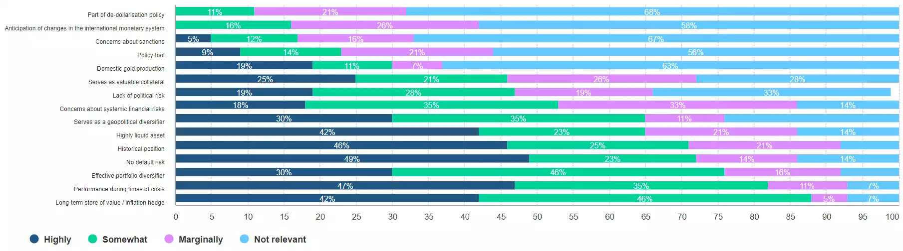 When asked what proportion of total reserves will be denominated in gold in five years, 69% of respondents expected holdings to be higher or significantly higher, while 18% expected holdings to be unchanged, and only 13% of respondents thought that gold holdings would represent a smaller share of reserves.