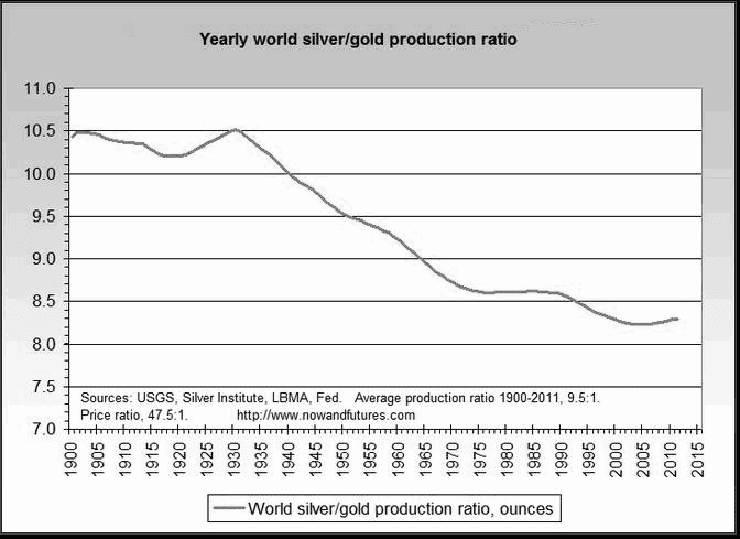 Source: http://www.24hgold.com/english/news-gold-silver-world-production-of-silver-and-gold-ratio.aspx?article=4336128046G10020&redirect=false&contributor=Jesse