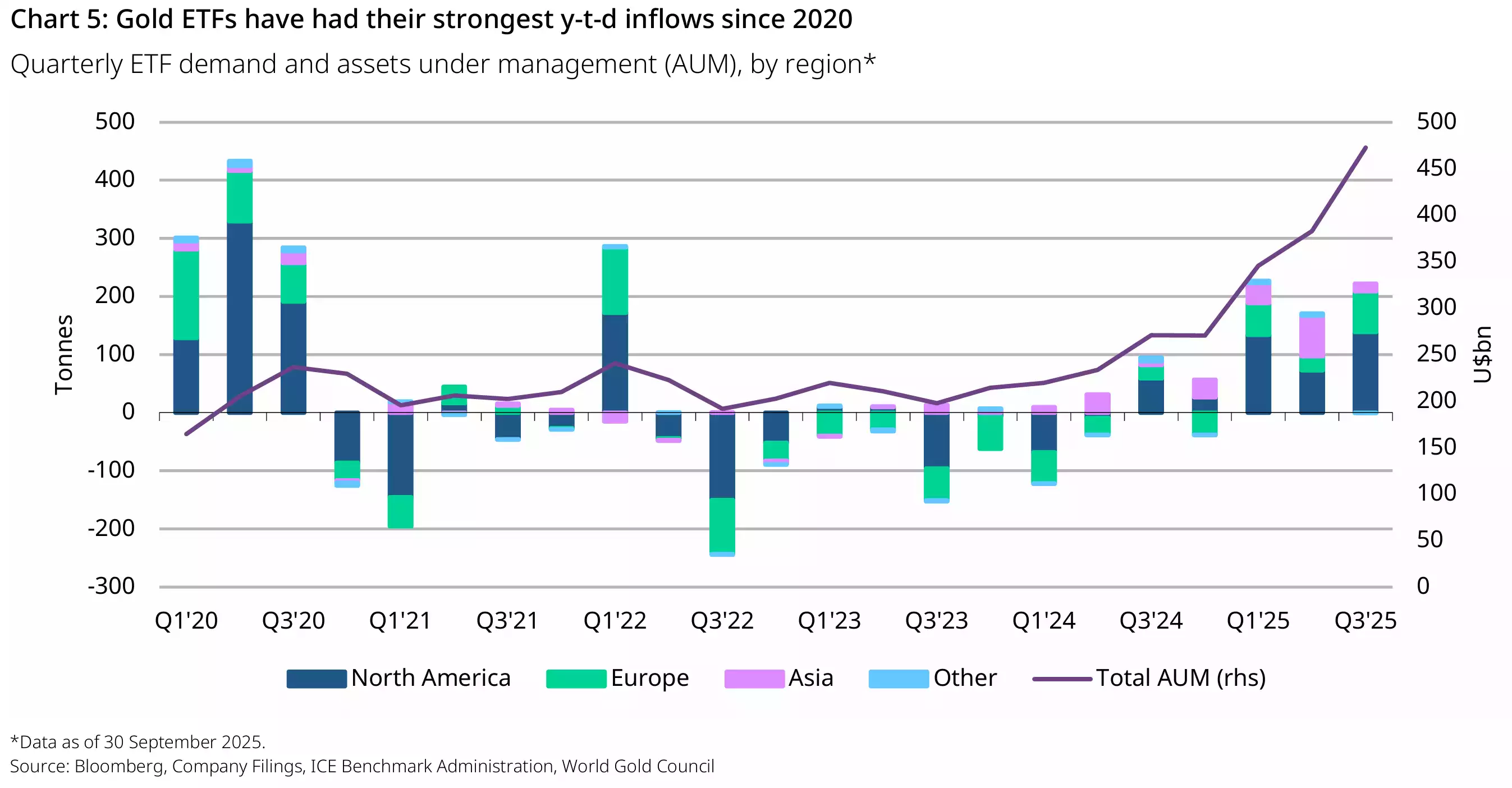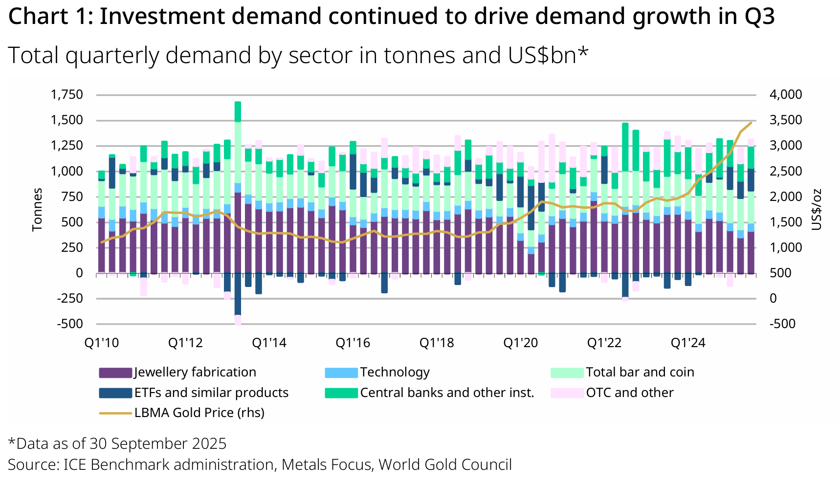 The World Gold Council’s latest Gold Demand Trends report shows global demand reached a record 1,313 tonnes in Q3 2025—up 3% year-on-year—despite pressure from record-high prices. The surge in demand was led by investors, particularly those funnelling into gold-backed ETFs, which added 222t in Q3. In value terms, demand soared 44% to US$146bn, driven by a 16% quarter-on-quarter price rally that lifted the average gold price to US$3,456/oz.