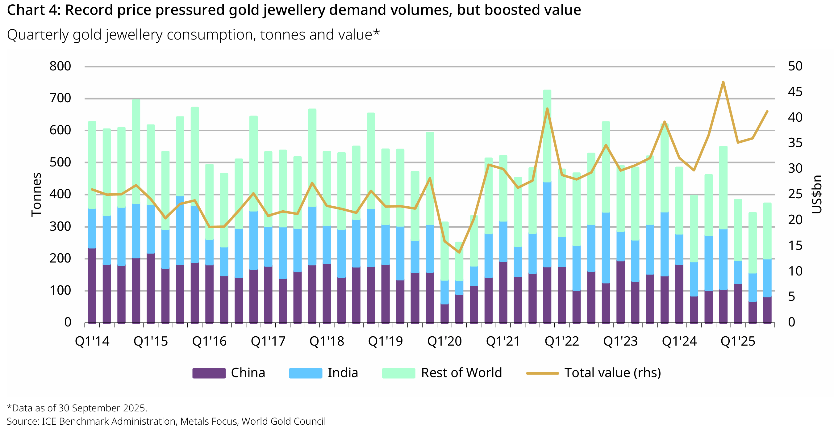 High prices weighed heavily on jewellery consumption, which fell 19% y/y to 371t—the weakest Q3 since 2020. Both China and India saw notable declines in volume, although value-based measures of demand rose as consumers spent more per item. In both markets, there are signs of substitution towards lighter or lower-carat pieces, and in some cases, bar and coin products replacing traditional jewellery.