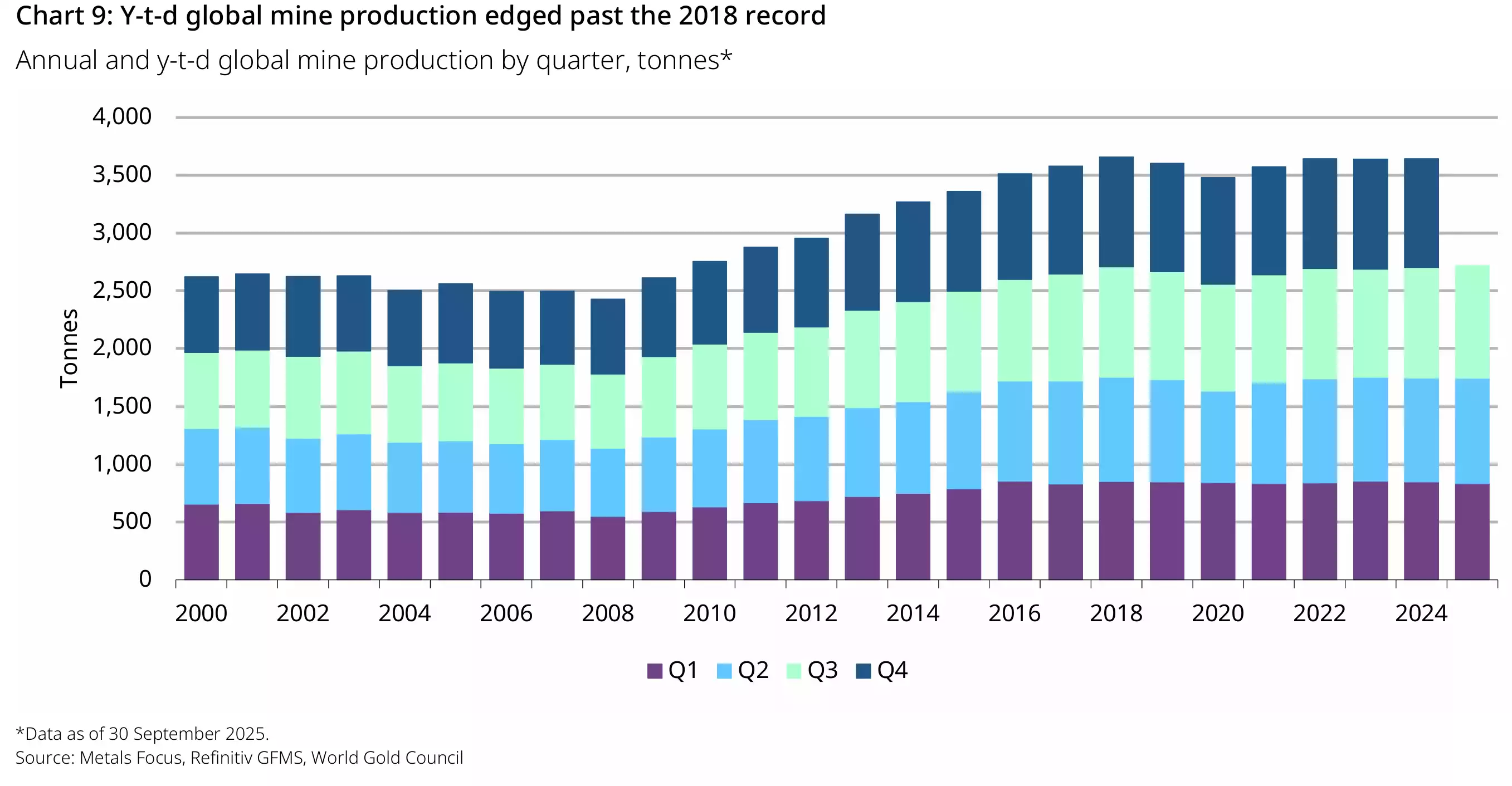 Total supply rose 3% y/y to match demand at 1,313t, supported by seasonal gains in mine production (up 2% y/y) and continued high levels of recycling. Growth was led by new and expanding operations in Canada, Ghana and Australia. However, elevated gold prices have yet to trigger a notable increase in producer hedging or distress recycling—both indicators that market participants remain confident in the rally’s sustainability.