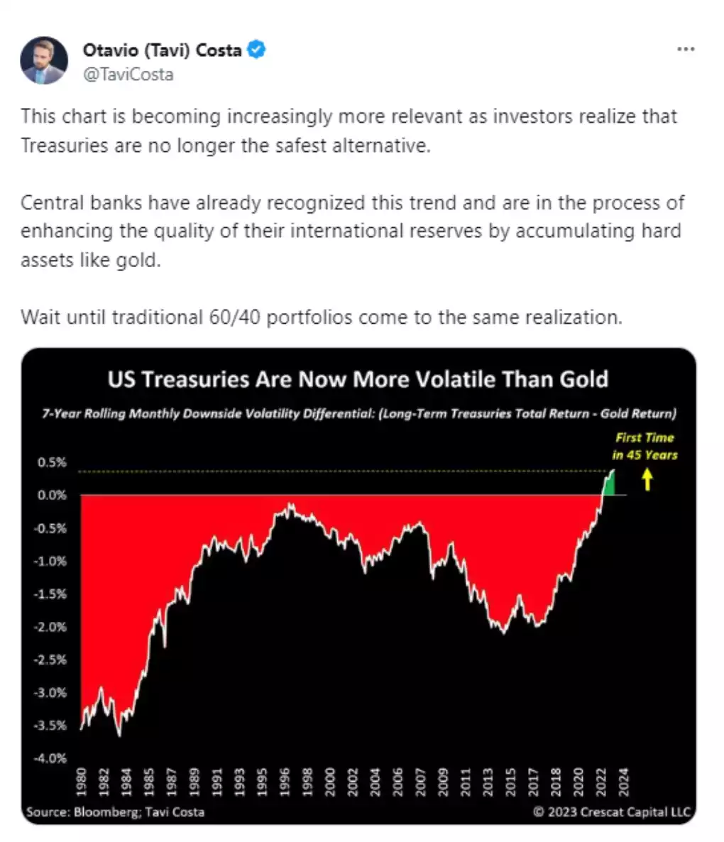 We have written at length about the increasingly volatile and ‘less safe’ US Treasuries. US Treasuries were once the benchmark of ‘risk free asset’ but are increasingly NOT as its issuer, the US Government, continues to recklessly abuse the power entrusted in it as the world’s reserve currency issuer.  As we all know, the US has produced over half the US dollars ever created in just the last few years. It is debasement of a Zimbabwean or Venezuelan order and the US Treasuries underpin it all.  That same dollar has been unilaterally weaponised against enemy states to the point where the BRICS bloc increases talking of an alternative and the Saudi’s, custodians of the petro dollar pact providing a safe base to that reserve status, have joined that very same group and are trading oil for gold.