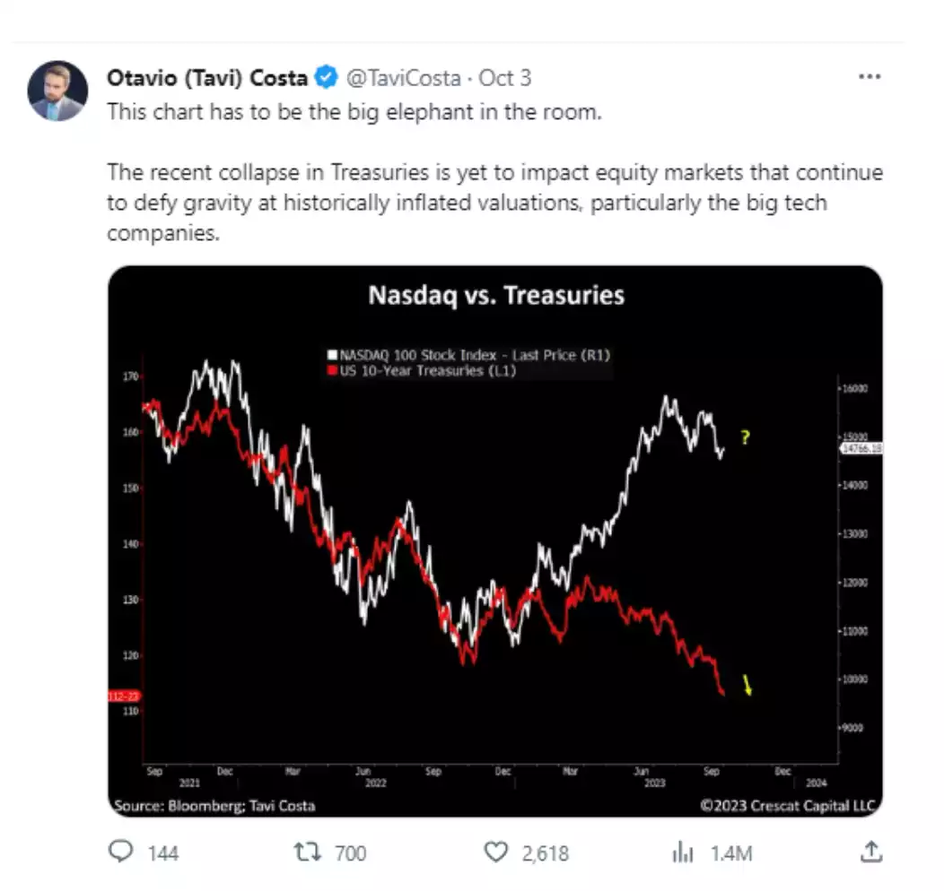 A key theme of recent years is the rapacious accumulation of gold by central banks as we have reported numerous times.  Topically on that disconnect between bonds and shares, he earlier tweeted about bonds v NASDAQ….