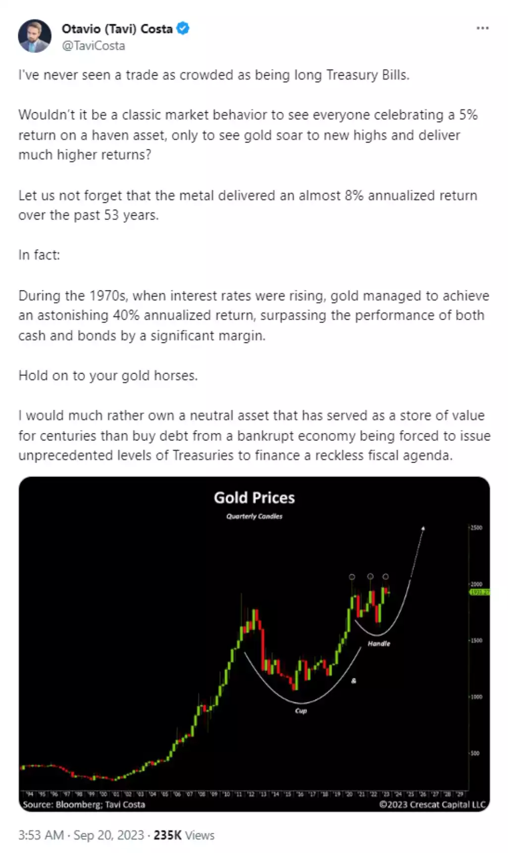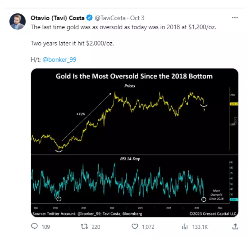 What has some confused is why gold is relatively languishing given the macro back drop. This is largely because those higher yields (off lower bond prices) are traditionally a head wind for gold which does not yield. However, with bond yields around 5% you would ordinarily expect gold much lower than it is now.  It is being incredibly resilient in the face of those high yields because people are reading the play on WHY the yields are high and what will inevitably follow. The following highlights just how oversold gold still is though and what happened last time…