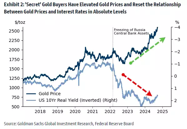 Last week, we explored the apparent secret gold purchases by Saudi Arabia since 2022. The below chart by Goldman Sachs demonstrates how the gold prices relate to changes in interest rates, but, since 2022, a buyer (who prefers to keep quiet) has reset the relationship in terms of absolute levels.