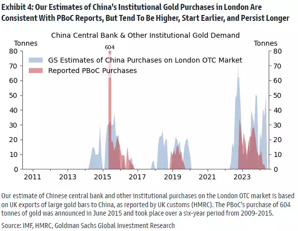 With its reported streak of 18 consecutive months of purchases since November 2022, The People’s Bank of China has been a focus for gold investors. Goldman Sachs’ estimates of their institutional gold purchases in the London OTC market align with the PBoC reports but tend to be higher and longer lasting.