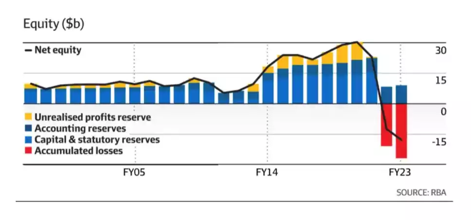 In September 2022 the RBA saw a Mark to Market loss of $44.9 billion on its $300 billion emergency bond issuance from the covid era. These bonds, due to rising interest rates, depreciated $44.9 billion. This wiped out the RBA’s equity, and left it with negative equity of $12.4 billion. Fast forward to 2023, with interest rates having lifted from 2.35% in September 2022 to 4.1%, these mark to market losses are growing, another $5 billion being added to the banks negative equity this year. Worsening this is that with negative equity of $18 billion, the forecasts are for this to in fact worsen to $27 billion by 2025 and not to return to positive equity until 2030 (based on lots of positive assumptions).