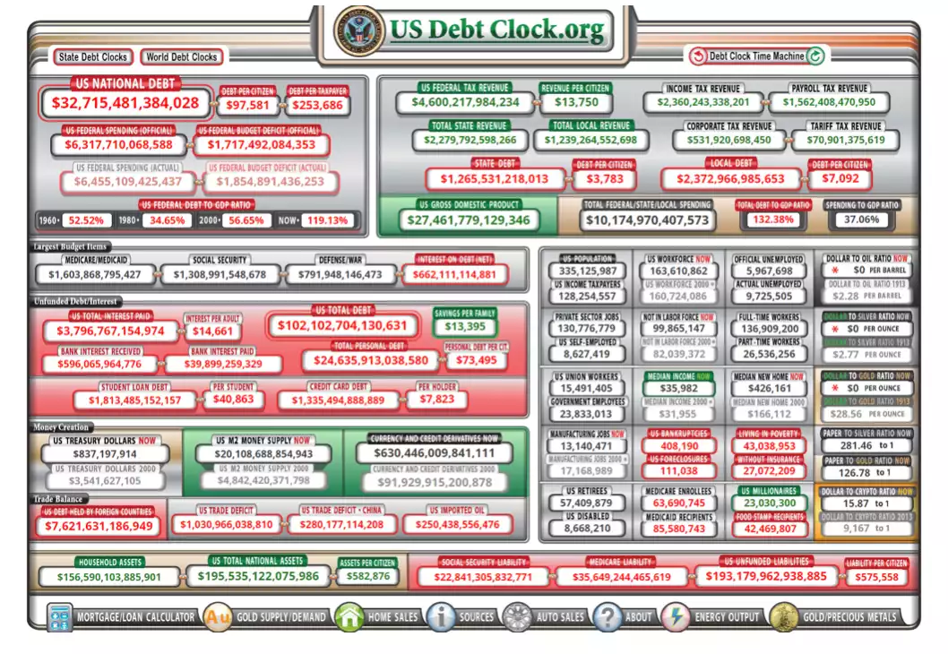 The debt clock – one of the most amazing websites to recheck on every couple of months hit a US National Debt of $32.7 trillion last night.