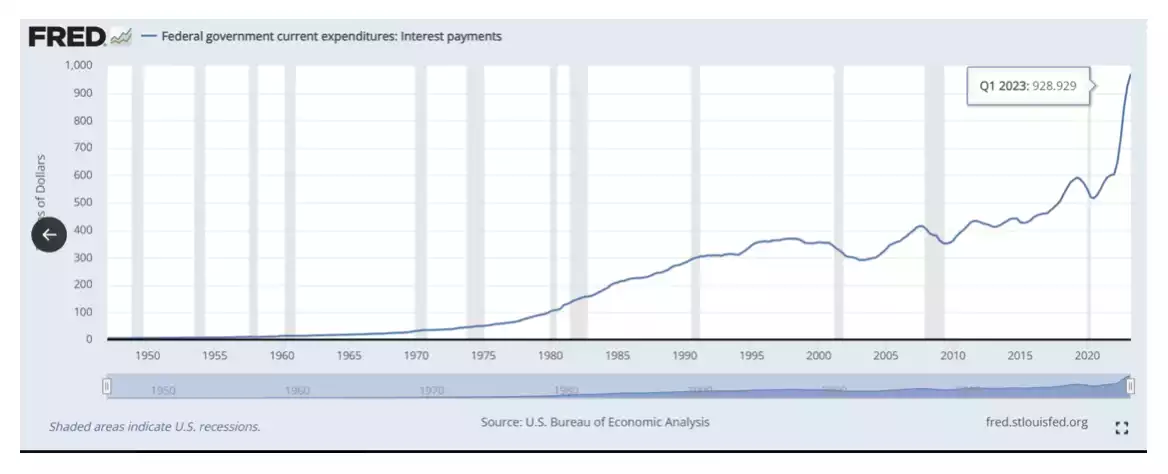 The shear scale and demand for US bonds and ever diminishing prices and ever greater returns, means the US who was previously paying $500billion in interest is now paying ever so close to $1 trillion. What you need to remember here though is the increase in interest is on new or replaced bonds which during the covid $6 trillion spend was at near 0%, new issuance on the current deficit is at 4.3% (a new overnight record as bonds continue to fall).