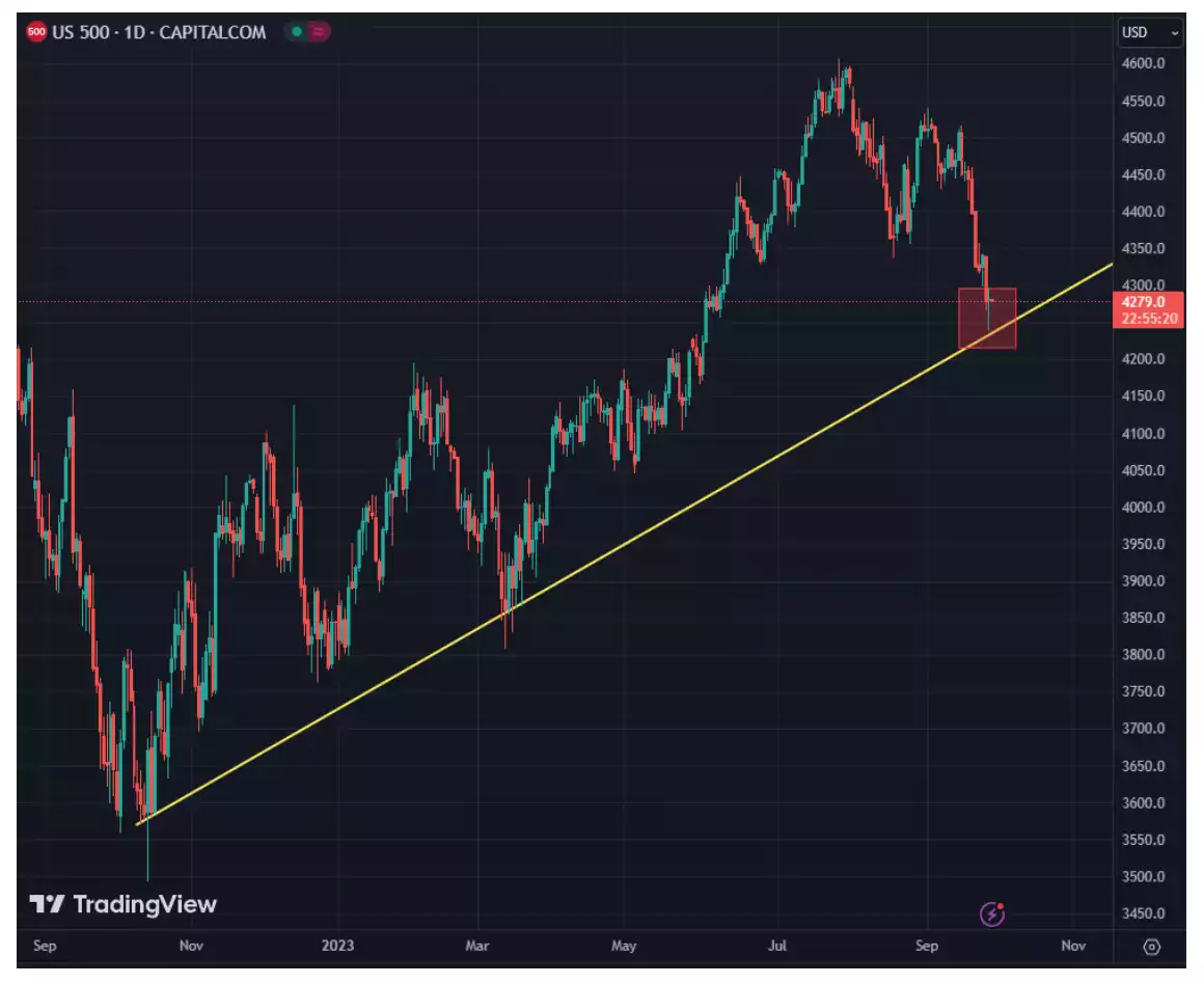 Both narratives mentioned have been crushed by the Fed officials’ recent statements and one thing is clear: They were not exaggerating. Rates were and are being held high and the detriment is appearing in the markets. The S&P has been knocked down 5% in the last roughly 1 week. Notice the trend line (in yellow) on the chart below. The S&P 500 has maintained staying on top of it for roughly 1 year but is now facing a critical retest. If the price breaks below the yellow line, this could be a massive sell signal for investors and could evaporate hope of a nearby bull market.