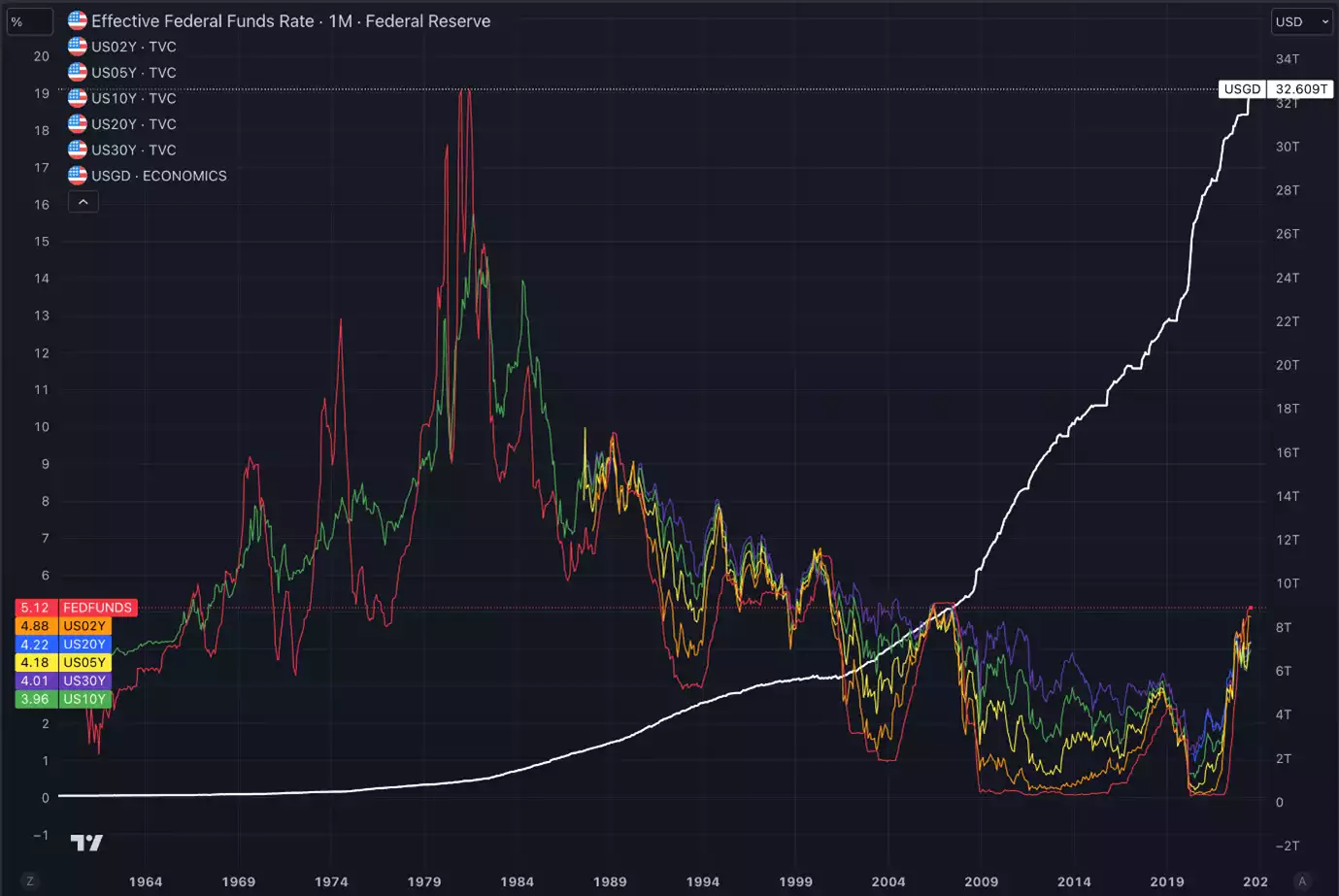 Just like in the 2008 GFC, with high interest rates and underpriced debt, investors are likely underpricing bonds (including government) with risk not being fully priced in. If this risk is repriced, this will see bond prices drop even further and interest rate returns lifting higher outside of central bank intervention. If this does happen central banks will in fact be forced to drop rates to accommodate risk premiums. We discussed this last week on Insights and shared the following chart clearly showing the Fed Funds rates sitting above ALL the US bond returns. That is a clear indication of a broken market as bond buyers get no premium for taking on the term risk of those bonds.