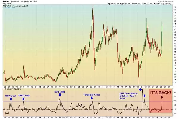 Oil markets are sending a clear warning for the global economy. The chart below highlights a consistent relationship between the 12 month rate of change in oil prices moving above 100 and the onset of global financial crises