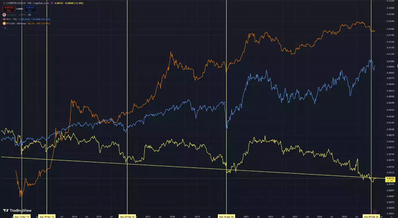 Alongside these stresses, there are early signals that liquidity conditions may begin to shift. The copper to gold ratio is one such indicator, which typically bottoms ahead of rallies in liquidity sensitive assets. The chart below shows this ratio, in yellow, turning before major moves in markets such as Bitcoin and the Russell 2000.