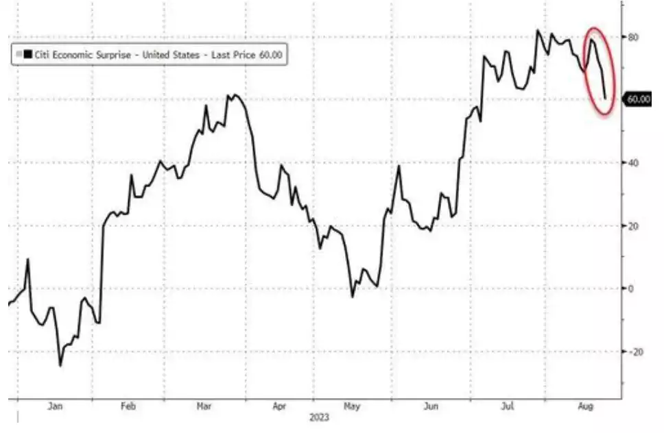 US Services PMI data just came out worse than expected and the reaction by most markets has been overwhelmingly positive. The S&P500 has popped up roughly 1%, signalling that there is still a view that the Fed is more talk than walk, and that more economic pain simply means a higher chance that the Fed will come to the rescue. Gold also rallied 1% and silver surged up 3% whilst bonds reversed their treacherous march. And so we have the return of ‘bad news is good news’ as the market gags for the Fed to ease up. Indeed this week has seen the biggest string of bad economic news since April (courtesy of the Citi Economic Surprise Index)…