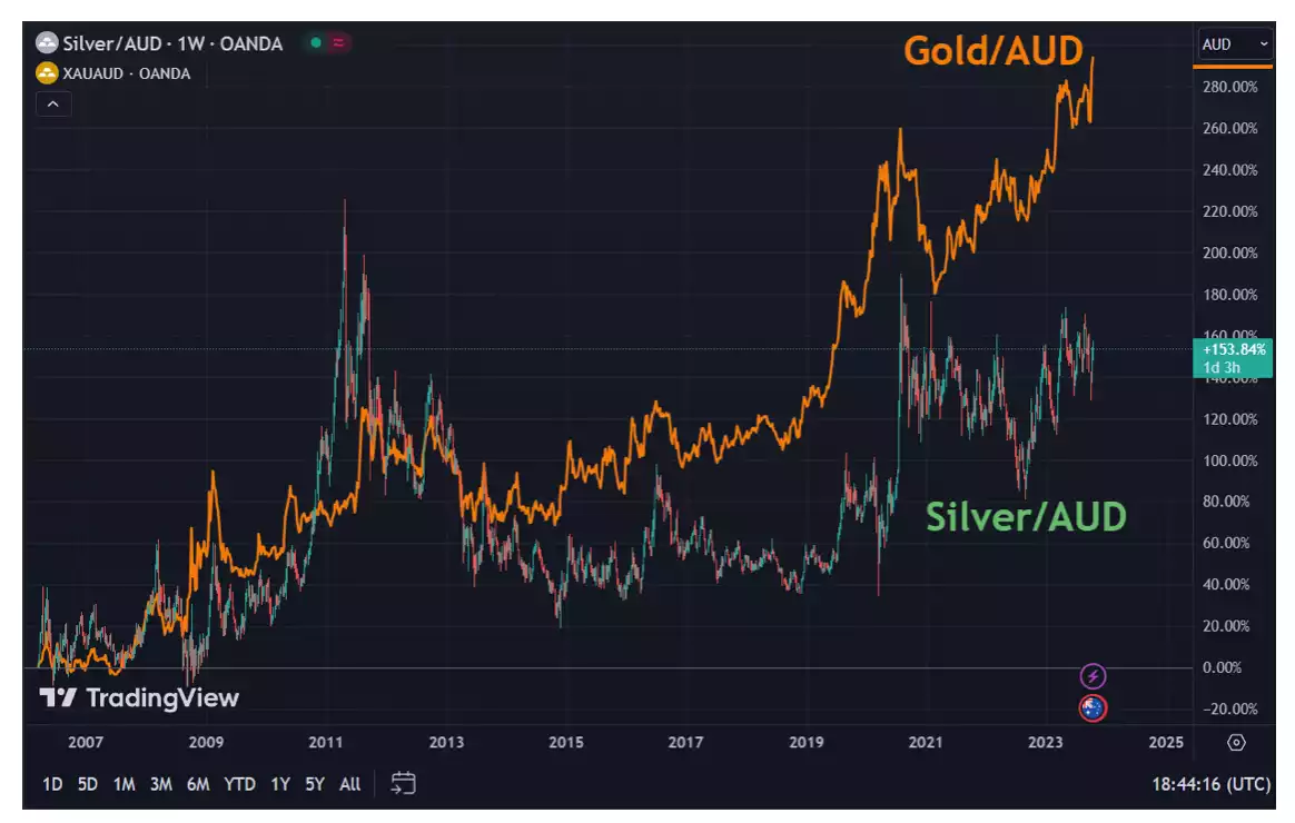Throughout history, the gold-to-silver ratio has been a vital indicator for investors as civilisations used both gold and silver (real money) for thousands of years. In the modern era, especially in times of economic uncertainty, this ratio has tended to contract, meaning a rise in the value of silver compared to gold. So far, the aforementioned drivers have had a potent effect on gold, helping it reach all-time-highs in Australian Dollars, but it has yet to move silver similarly.