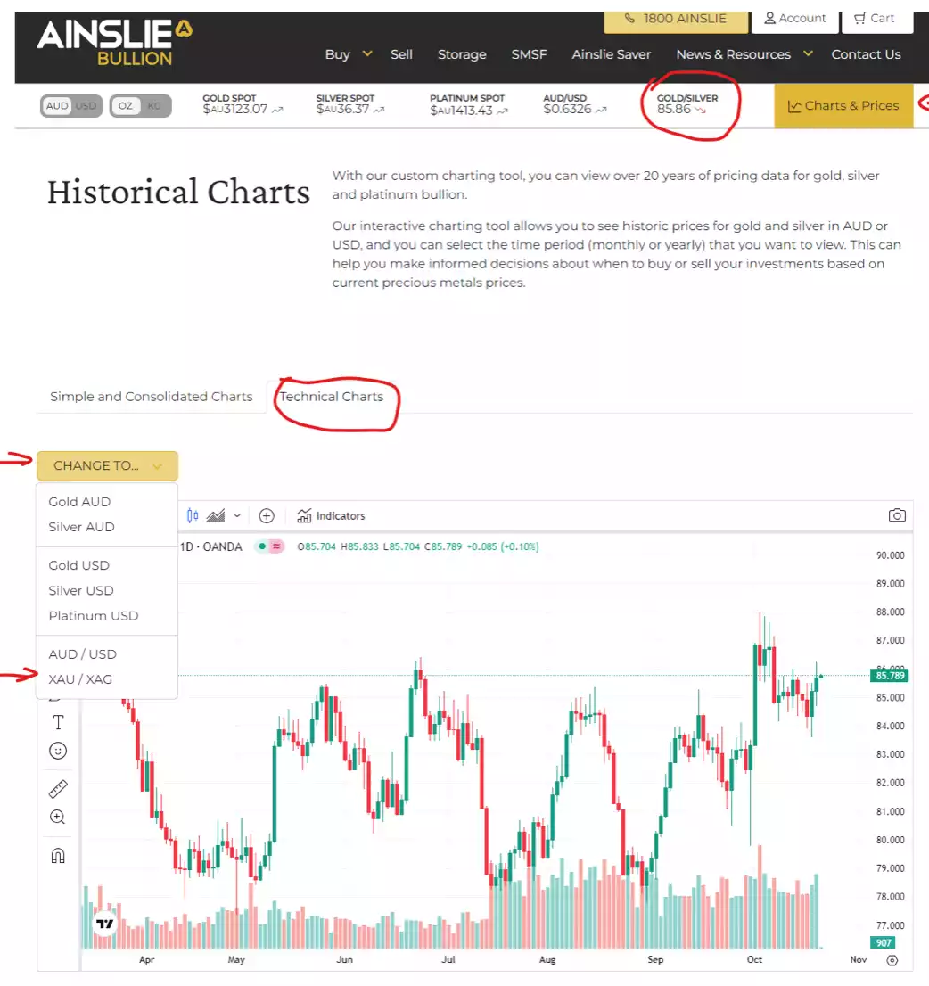 Remember you can watch the GSR easily on our website. It’s always displayed on the price ticker at the top of the site and you can see charts of it but clicking on the gold coloured Charts & Prices button to the right of the ticker, selecting Technical Charts and then Change To the XAU/XAG chart per below: