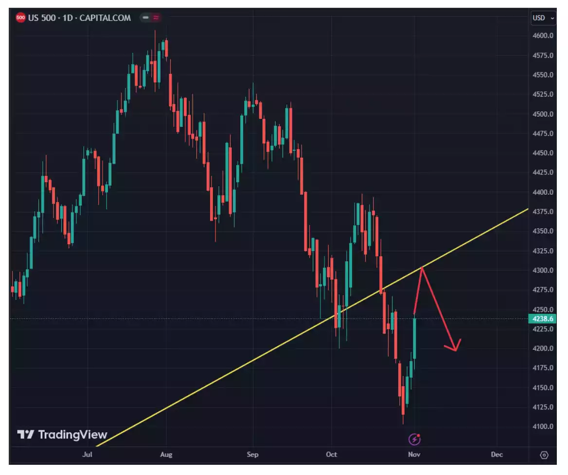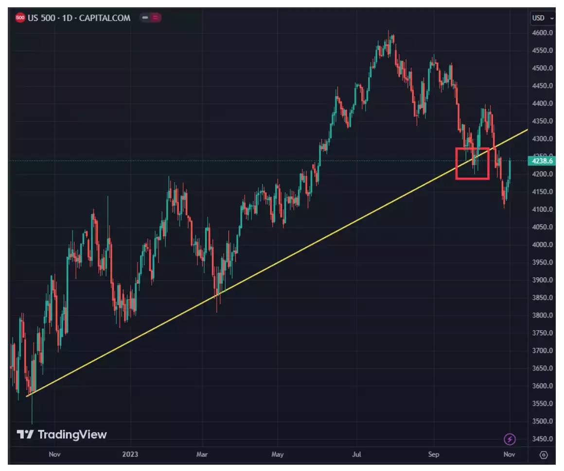 These stock market increases that happened the past couple days paint a rosy picture, but as mentioned previously, the beginning of October had the S&P 500 break a roughly 1 year trend line - a technical signal which predicted its aggressive fall throughout the second half of the month. Despite the stampede of positive news articles with emotionally-driven titles, the index fell, just as the textbook technical pattern called for.