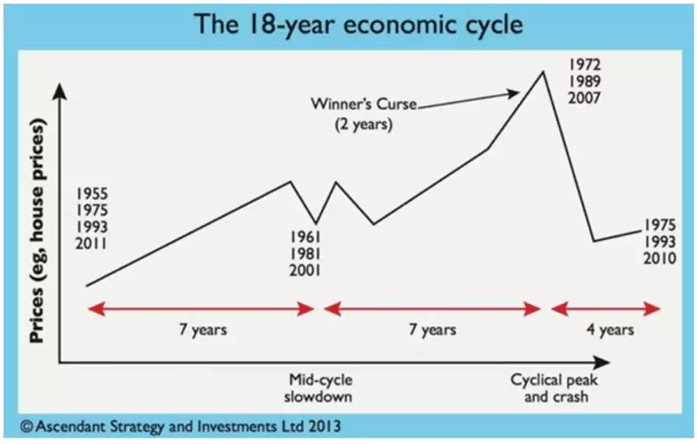Over the past 200 years, western economies have recorded an economic cycle that averages 18.6 years (The shortest on record is 17 years, with the longest being 21 years). Today we explore this cycle and its impact on land, stocks and gold prices – looking at where we currently sit – to help forecast what comes next.