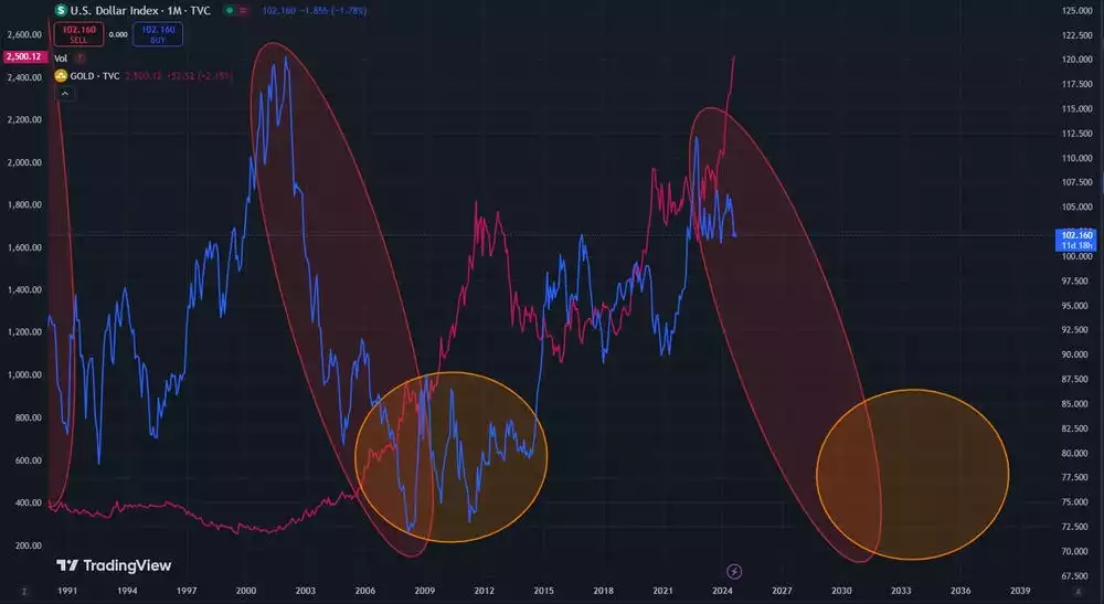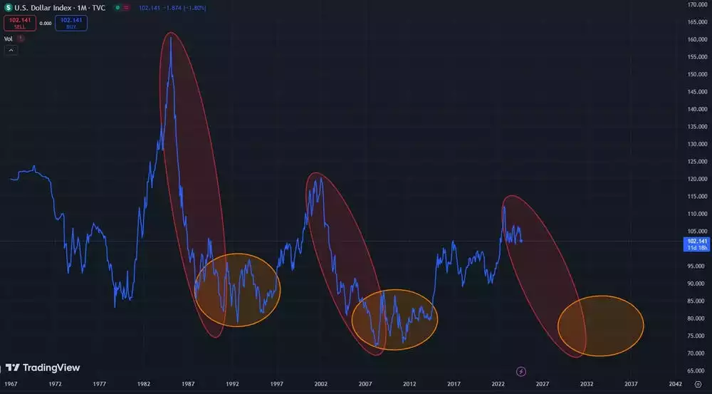 Phase 2 of the cycle (marked in red) and Phase 3 (marked in orange) - show the DXY getting hammered down in Phase 2 and moving sideways in Phase 3.