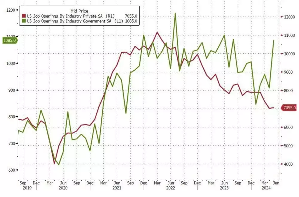 Amid a crumbling economy, the Biden administration is desperate to maintain the illusion of a strong labour market to aid in his run (or Kamala's run) in the upcoming presidential election. The near-record number of government job openings seems more like a tactic to project economic strength rather than a true reflection of job market health.