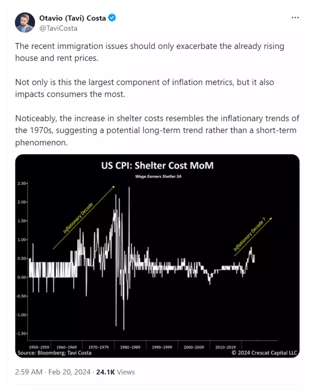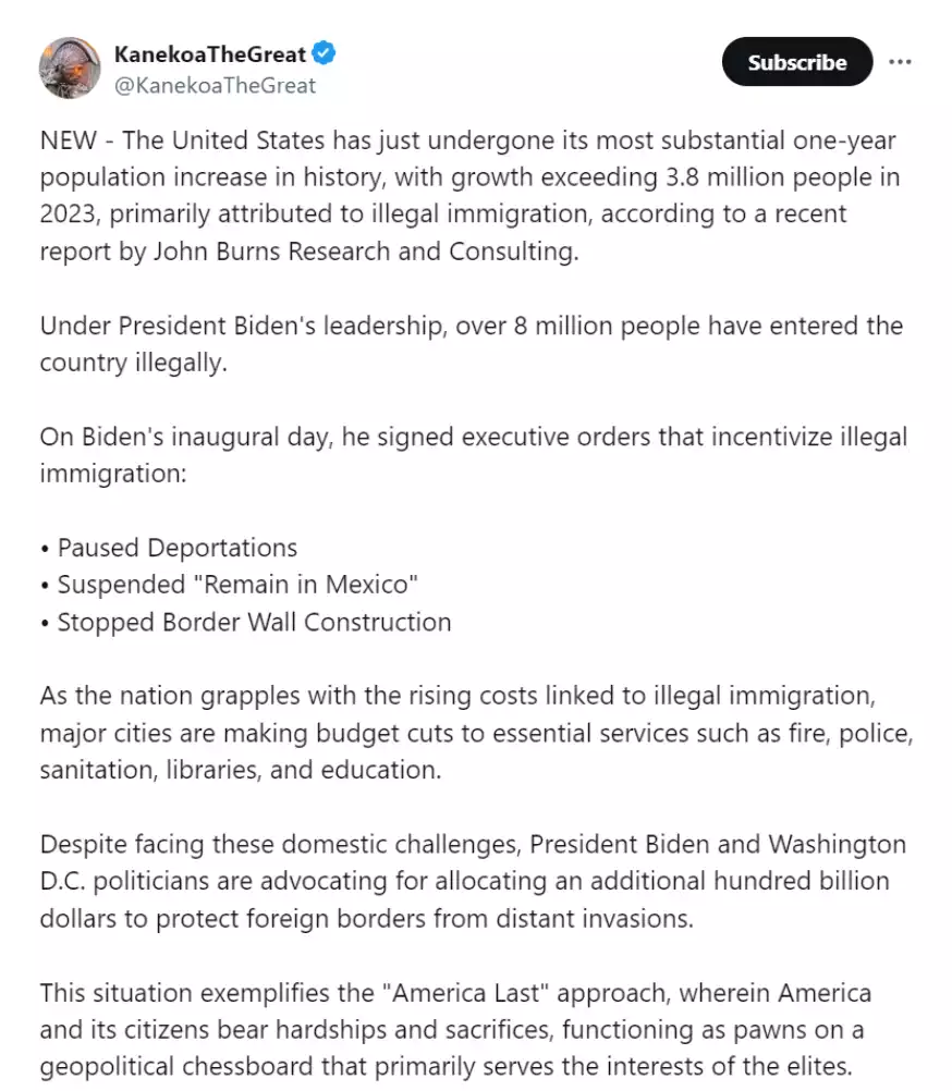 We have written extensively on Australia’s record 600,000 new immigrants last year propping up our GDP through importing new consumers masking the reality we are in a per capita recession right now. We also wrote to this being a global phenomenon and the Malthusian Trap Theory here. Its something governments don’t really want you to know as it lays bare the Ponzi scheme we are in where they need new participants to maintain the perception of growth and economic prosperity. Last week we then learned that like Australia and Canada, the USA saw its single biggest year in history of immigration, some 3.8 million people! Today we step through the implications of this and land on a powerful chart around what’s next…