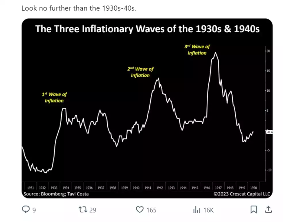 Author of the above, Crescat Capital’s Tavi Costa has long been vocal on the inflationary period we have just experienced being only the first of 3 waves, just as we saw in the 70’s and also the 30’s & 40’s: