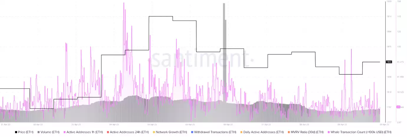 Over the last week, the Ethereum price has been stuck in the US$1,800 to $1,900 range – and appears to be attempting to break out higher at the time of writing. This price stagnation is due to a decline in whale activity and flat exchange balances, hinting at cautious ETH traders. Ethereum faces challenges in surpassing the $2,000 resistance, and Ether whales' scepticism has contributed to the price stagnation. With decreased coin supply on exchanges, it suggests potential short-term profit booking. Sentiment data shows a significant drop in Ether transactions over $100,000, and this Ethereum price stagnation is linked to the Shanghai/Capella upgrade countdown.