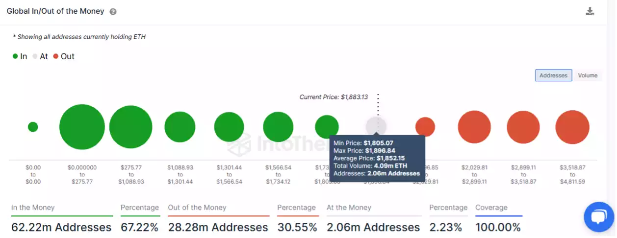 Global in/out of the money (GIOMAP) data suggests Ethereum's price is vulnerable below the $1,835 support level. Bears may take control if bulls show reluctance. 2.06 million addresses with 4.09 million ETH provide support between $1,805 to $1,896. Failure to hold support could result in a drop to $1,753. Ethereum's price could surpass $2,000 if sidelined investors enter the market. 1.7 million addresses may sell 1.84 million ETH after breaking even under $2,000. In highly bullish scenarios, Ethereum's price could reach the $2,500 resistance level.