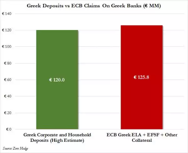Reading the paper today you’d think the Greek default ‘can’ has been kicked down the road with another 6 month extension and after another EUR1.8b ELA (Emergency Liquidity Assistance) on Monday after another EUR3.2b in cash was withdrawn from Greek banks over Friday and the weekend. But the problem with papers are they lock one bit of news in for 24 hours and this keeps changing. It seems now that Germany’s Merkel is less confident, saying there is no consideration of an extension yet. This will continue until it doesn’t, and probably with little warning. There is plenty of speculation in the market, some by none other than Goldman Sachs, that Germany et al may not care about a Greek default as it will conveniently weaken the EUR and the ECB will just fix it all up with even more quantitative easing (money printing, on top of its current EUR1.4 trillion program). You know, just like the US did after the GFC… But what of the Greek people and the unintended consequences on derivatives and the like? On the former, the graph below tells a scary story… its Cyprus all over again when/if the ECB pull the ELA support net. You see there are now less deposits than ECB support. Remove that support and the banks have no choice but to “bail in” ala Cyprus and take all the deposits. Classic catch 22 wherein that is the very reason why everyone is pulling out their money in the first place. The graph below paints a sobering picture. On the latter, it’s the unknown ramifications on the $710 trillion derivatives market that has some very scared. We’ll touch on that in another post soon…