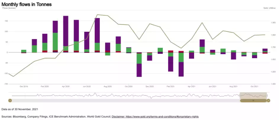 Some of the funds may be rotating to counter cyclical plays. In November, gold ETFs saw net inflows in November of 14t (US$838mn), the first since May.