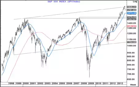 As gold and silver appear to be coming off last year’s lows, with both up nearly 7%, the sharemarket looks more and more near its top. Something usually triggers a fall and right now we have a cocktail of issues as the world struggles with the concept of tapering. The graph below shows that the US stockmarket is certainly stretched beyond the 2007 peak and getting close to the 2000 peak. At this 15 Jan 2014 snapshot it was 12% above the 55 week moving average (blue WMA) which itself was 20% above the 200 (red) WMA. 2007 was 8.5% & 14.5% respectively and 2000 was 14% & 29.5%. The question is do you prefer buying after a market correction or just before it??