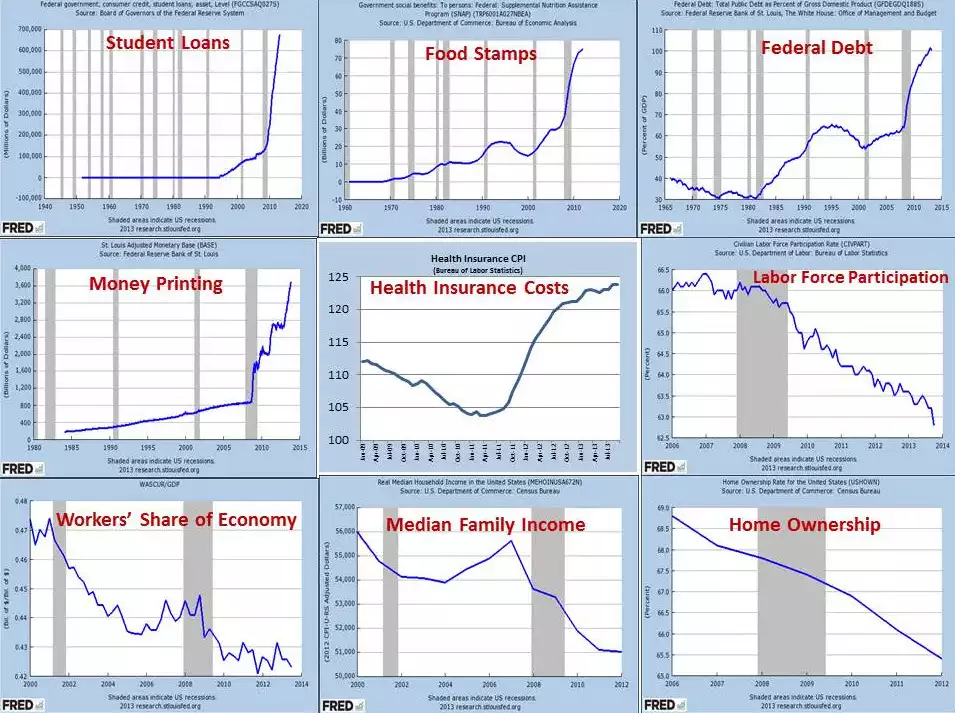 So what of these other parabolic / exponential / skyrocketing charts? The collection below has been doing the rounds and if you’ve missed them they paint a pretty clear picture – your ‘gut feel’ barometer should be warning of storms ahead. It’s US centric and politically motivated but a) the US is supposedly the new global economic saviour, and b) it’s typical of the world as a whole. It’s a bit hard to read but just know that the vertical grey shaded bars mark recessions. That last big one of course was the GFC. In short it paints a clear picture of rampant money printing and debt accumulation in a reflation effort post GFC. But it’s not working. US Durable Goods Orders were abysmal on Friday – a clear sign of a weak economy. Wall Steet boomed Friday night our time as that combined with Japan’s easing had the traders convinced more easing from the Fed is coming (Australia rallied yesterday on the same). The charts below show that stimulus might be great for Wall Street (for now) but it’s not working for Main Street and that will eventually see the whole thing come crashing down.