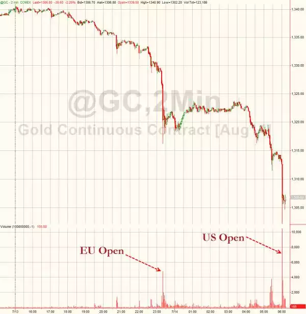 Keeping that in mind, ask yourself if the chart below (courtesy of Zero Hedge) looks natural? Zero Hedge reported that US open hit was no less than a $1.37b notional flush. But as we’ve said before, and as we saw in 2011, when there is a squeeze in supply they quickly lose control and the price takes off. There is a lot of data indicating that is not far away and many gold commentators have been calling the next ‘bottom’ the last before it takes off. Timing your buy? There is a much repeated gold commentator quote of “I’d rather be a year early [buying] than a day late”.