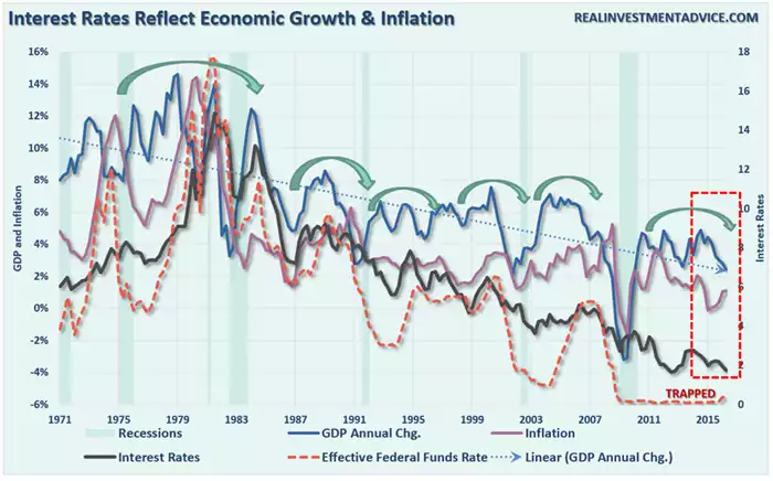The problem for the Federal Reserve is that getting caught in a liquidity trap was not an unforeseen outcome of monetary policy, but rather an inevitable conclusion. As shown in the chart below the more active the Fed has become with monetary policy, the lower the eventual rates of GDP, inflation, and interest rates has become. As stated, the current low levels of inflation, interest rates, and economic growth are the result of more than 30-years of misguided monetary policies that have led to a continued misallocation of capital.”