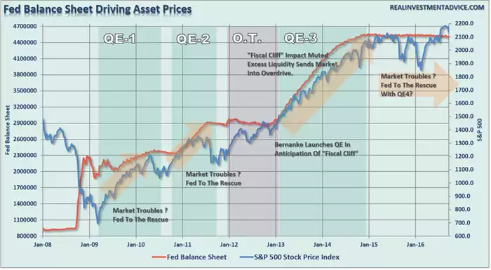 Unwittingly, the Fed has now become co-dependent on the markets. If they move to tighten monetary policy, the market sells-off impacting consumer confidence and pushes economic growth rates lower. With economic growth already running below 2%, there is very little leeway for the Fed to make a policy error at this juncture.